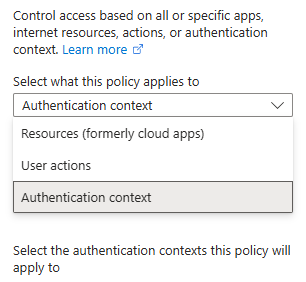 Target resource > Select “Authentication context” from the pull-down menu (This is new as of this writing. Microsoft documentation doesn’t currently reflect this menu). Then select the Authentication context you created earlier. If this is your first time using this feature, there will only be one choice.